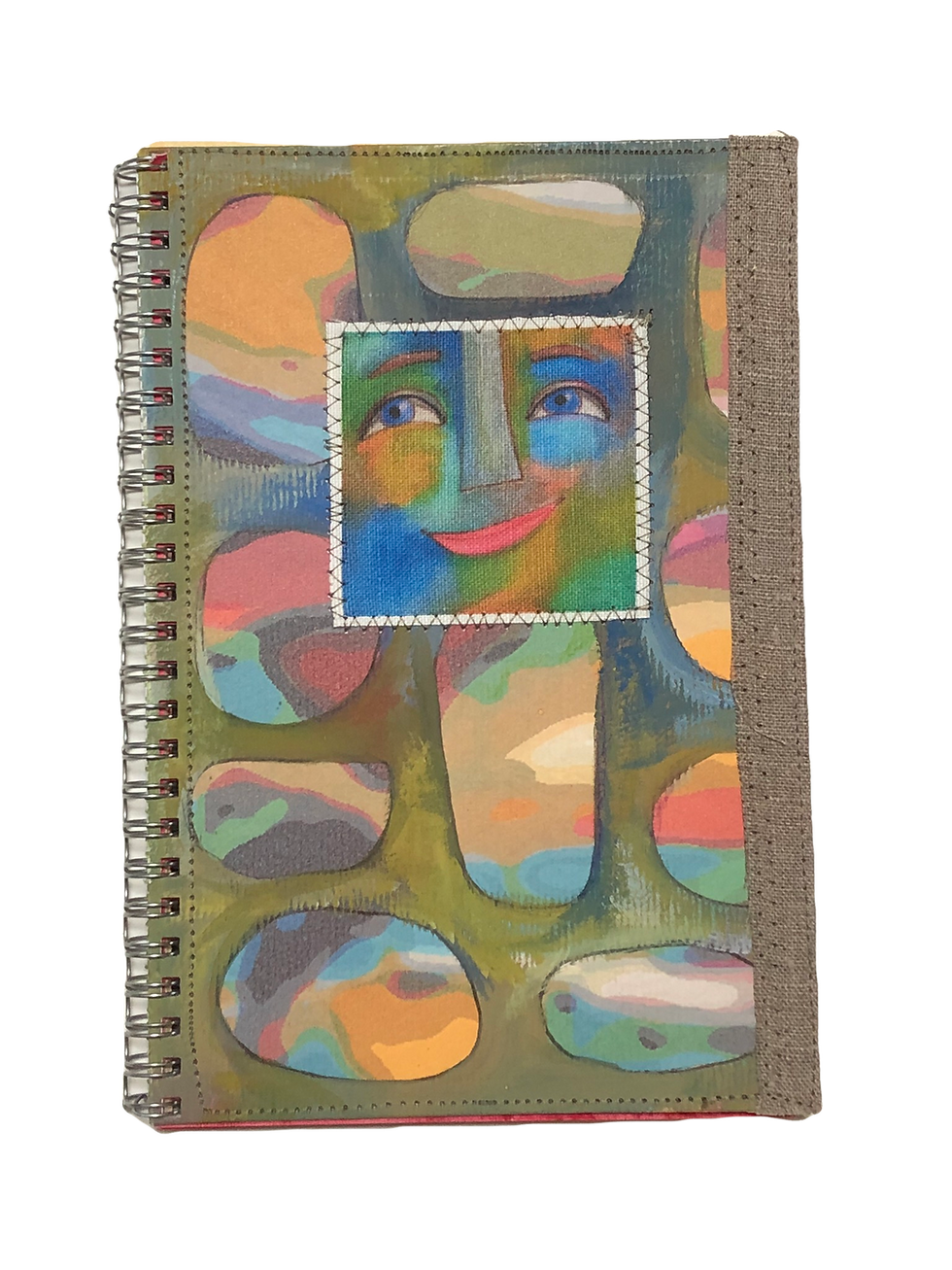 The covers, with edges bound in linen, are original artworks with one of my fabric faces stitched on. Inside the back cover is an envelope with further treasures for you to discover.